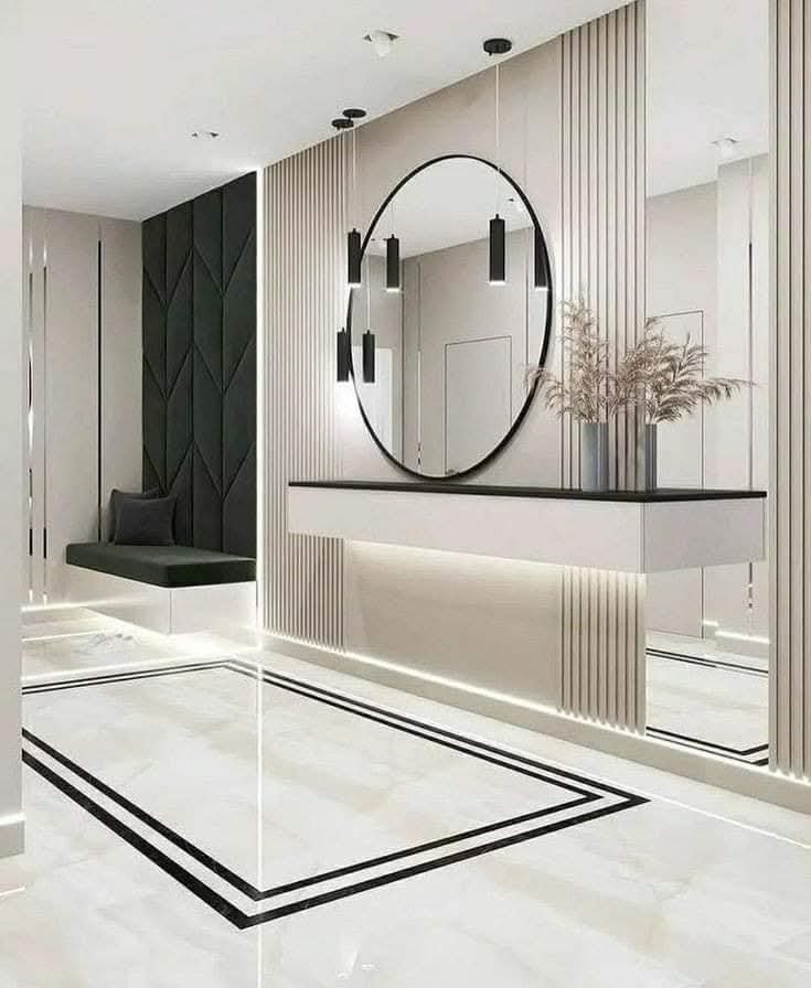 • الألوان الحيادية (البيج، العاجي، الرمادي الفاتح) تُستخدم كأساس، بينما تُضاف ألوان داكنة أو لمسات ذهبية أو نحاسية لإبراز التفاصيل وإظهار الفخامة.