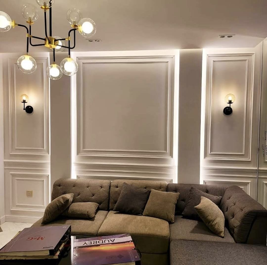 • وحدات إضاءة كبيرة كالثريات مع شرائط إضاءة LED مخفية تُبرز شكل السقف أو الزوايا.